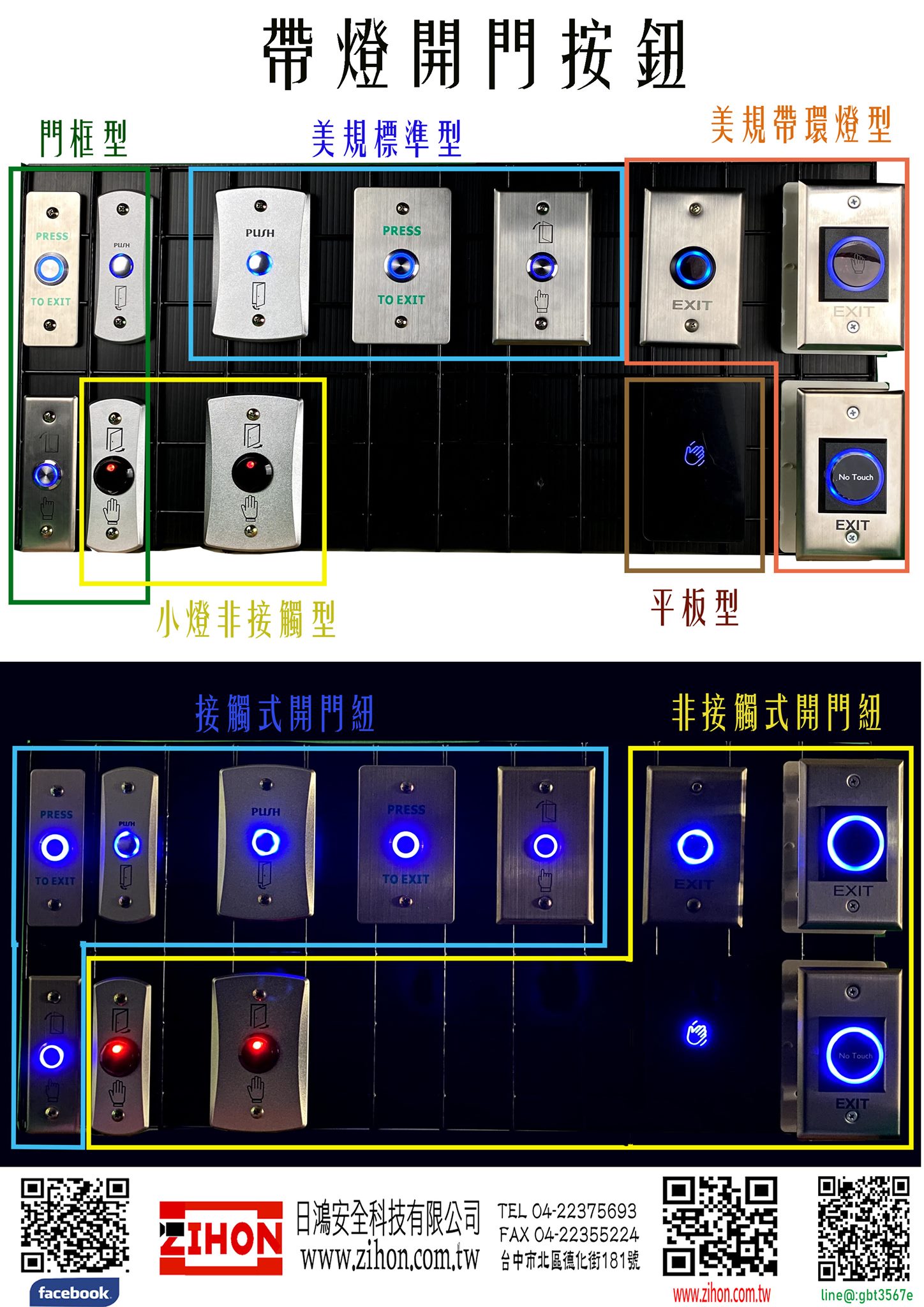 開門按鈕的樣式有許多,這一次先以帶燈式作大分類,以接觸式的和非接觸式作小分類,展示美規標準型和門框型,不鏽鋼和鍍鋅鋁擠造型,帶開門環燈和開門小燈等,另外夾帶一款平板造型,有需要的朋友可以參考看看。